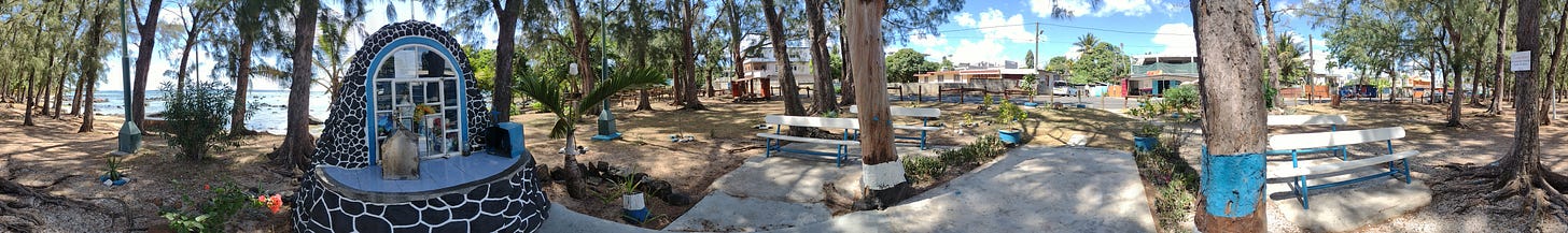 The cabbie has a pendant hanging from his rearview mirror with a very familiar design: “Allah” in Arabic script on one side, “Muhammad” on the other. So we do the superficial bonding over shared religion, and he chases that shot with the line that every Mauritian has at the ready: here, everyone of all religions gets along beautifully. All religions represented here, I think, remembering again the local Ansari Sufi Order’s profession of “unity across the Sunni.”