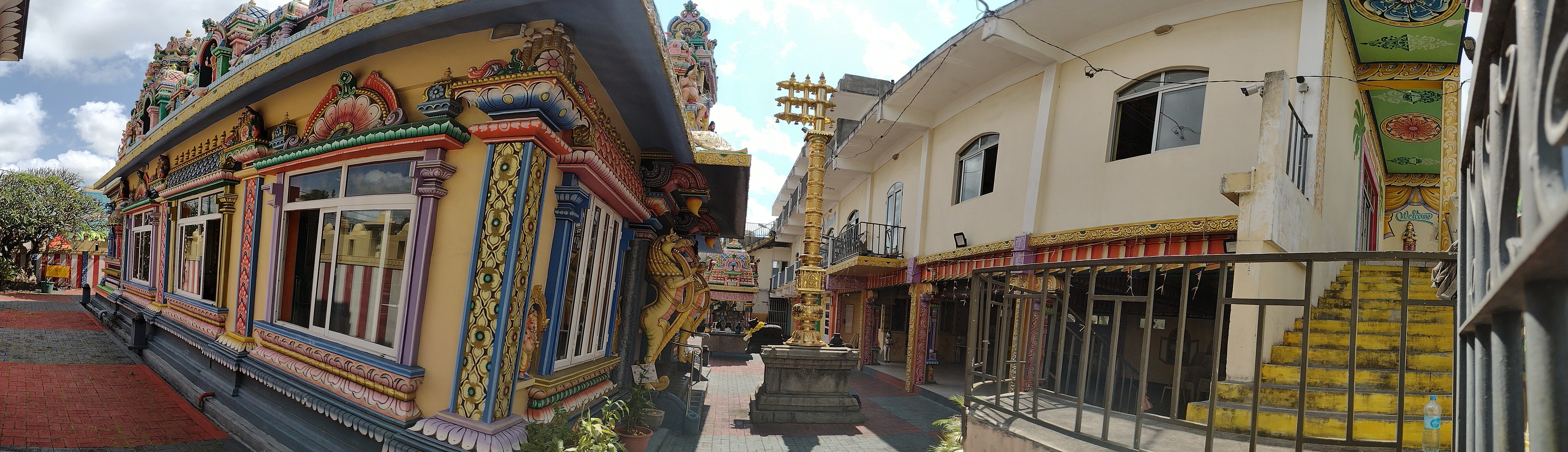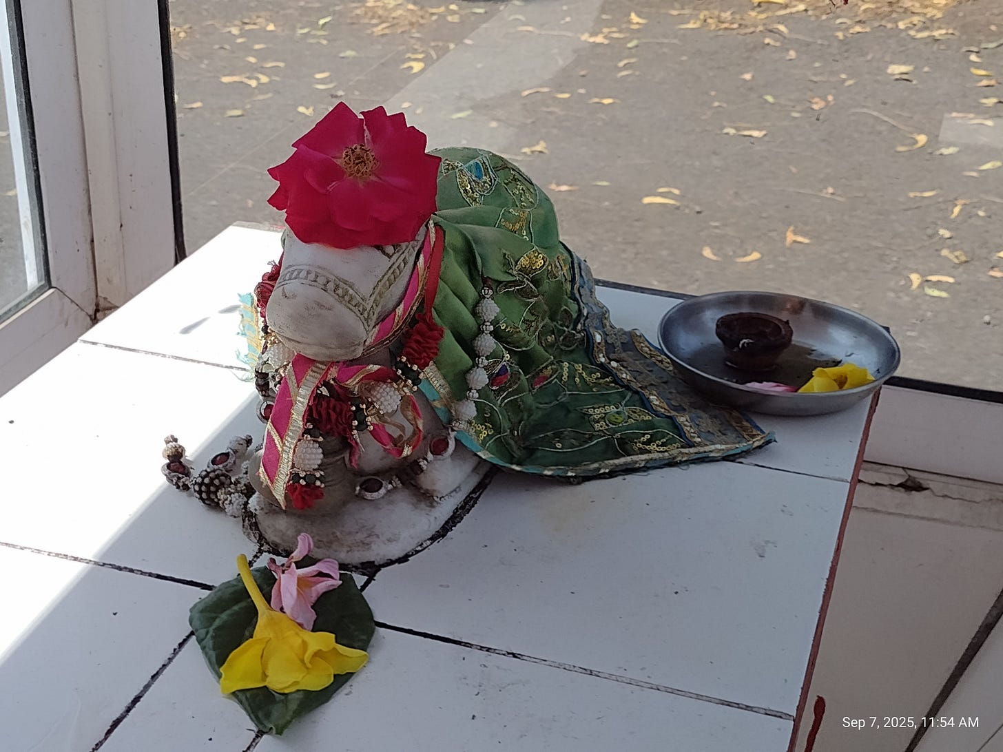 Everywhere there are signs of Hinduism. Shrines and temples large and small, icons flanking homes, Sanskrit lettering in iron fences. Dogs bark at me from behind fences and from rooftops, the ones outside shy away.